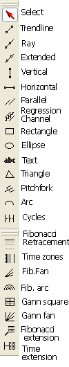 The default Select tool (red arrow) is used to select drawing objects and quotations on the chart. If you want to draw a given study, just switch on the appropriate button and start drawing on the chart by pointing the mouse where you want to start the drawing and click and hold the left mouse button. Then move the mouse. A study tracking line will appear. Release the left mouse button when you want to finish drawing. You can also cancel study drawing by pressing the ESC (escape) key. For a beginner's guide to charting, check Tutorial: Charting Guide
