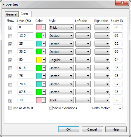 The properties window is used to change the square levels, color, style, thickness, and defaults. Click on any of the Gann Square Show entries to add or remove lines. Click in the square Color box to change the line color. Click on Style combo boxes to change the line style. Check the Use as Default box to save the settings as the default for all subsequent Gann Squares that are drawn. The "Left side" and "Right side" columns control the display of text that appears on the left and right side of the Gann lines. "Empty" means no text, % means percentage level, $ means dollar (point) level. "Study ID" column defines a study identifier that can be used in your custom formulas to detect crossovers. You can change these IDs if required by simply editing these fields. For more information on Study IDs, check Tutorial: Using Studies in AFL Formulas