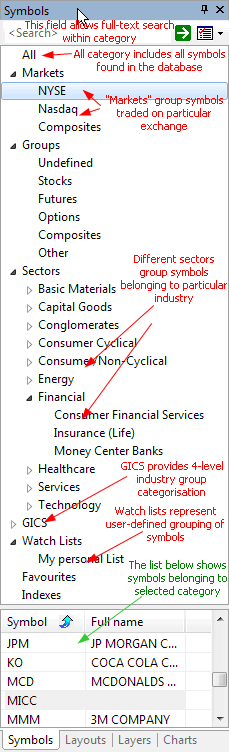 (usually) only once in a given tree leaf. The Symbols window is divided into three parts: The search box allows you to perform full-text searches (including wildcard matching) against symbol and full name within the selected category. For example, if you select the "Technology" sector and type A* (letter 'A' and wildcard character *), the symbol list will show all symbols belonging to the Technology sector with a symbol or full name beginning with the letter 'A'. Another example would be typing *-A0-FX; this will return all forex symbols in the eSignal database (those ending with the -A0-FX substring). The category tree (see the picture) shows different