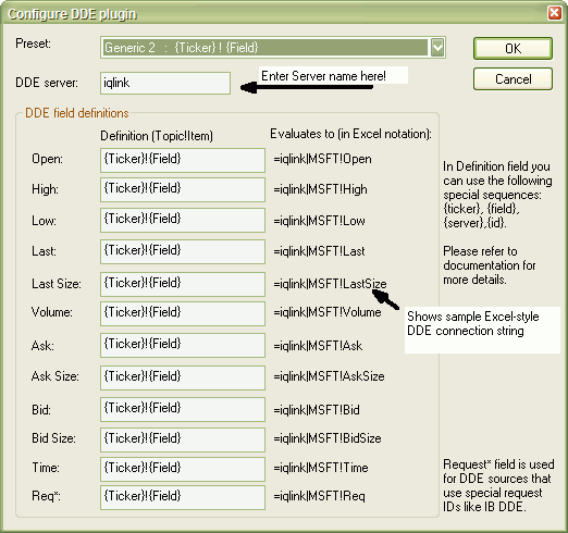 As you can see in the picture above, the DDE plugin allows you to use a few special strings, namely: {Ticker}, {Field}, {FieldSp}, {Server}, {Id} which are evaluated at runtime for each symbol separately, allowing you to construct dynamic DDE strings (depending, for example, on the selected ticker) required by most data sources: