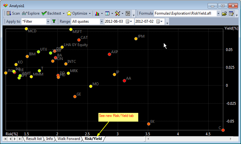 Version 5.60 brings a new feature to exploration - scatter X/Y charts. Scatter charts are useful to display relationships between many symbols, such as correlation, risk, etc. They can be seen as a replacement and upgrade for "Risk/Yield" map that was hard-coded to just one function. Now you can code your own X-Y charts that are not limited to just Risk/Yield maps.