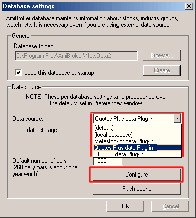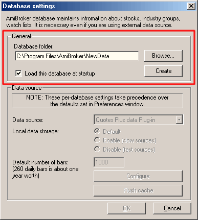 One of the new features introduced in AmiBroker version 3.90 is the ability to read directly from external databases. This is achieved by means of data plug-in DLLs that allow linking AmiBroker's database with an external source. Please note that although you will be using an external database, you will still need an AmiBroker database for storing additional information that is not supported by the external source such as hand-drawn studies, assignments to groups, watch lists, composites, and so on. You can find more information on AmiBroker database handling here.