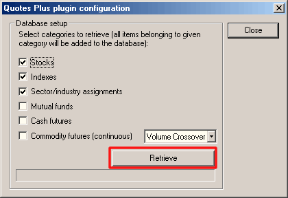 IMPORTANT: If there are new symbols added or old symbols deleted from the external data source, you will need to go to File->Database Settings->Configure and click "RETRIEVE" again to get new symbols.