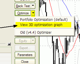 Once optimization is complete, you should click on the drop-down arrow on the Optimize button and choose View 3D optimization graph. In a few seconds, a colorful three-dimensional surface plot will appear in a 3D chart viewer window. An example 3D chart generated using the above formula is shown below.