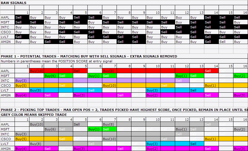 redundant (raw) signals are NOT removed, only one position per symbol allowed