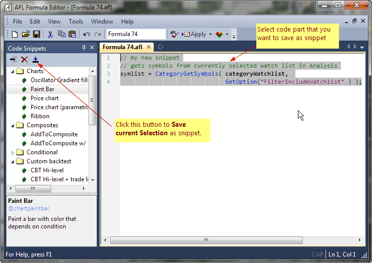 From then on, you can use your own snippet the same way as existing snippets. Perhaps the most convenient method is using drag-and-drop from the list to the AFL editor.