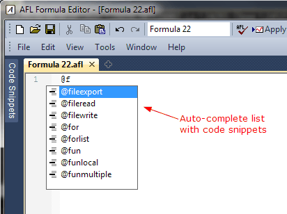 In version 5.90, code snippets are also available in the auto-complete list in the AFL editor. Just type '@' followed by the first letter of a snippet's key trigger, and the auto-complete list would show you the list of available snippets that have keyboard triggers defined starting with that letter.