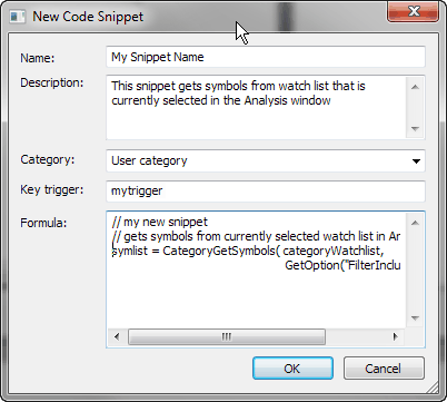 Now you need to enter the Name of the snippet, the Description, and Category. A category can be selected from already existing items (using a drop-down box), or a new category name can be typed in the category field. The Key trigger field is optional and contains the snippet's auto-complete trigger (described above). The Formula field is the snippet code itself. Once you enter all fields and press OK, your new snippet will appear in the list.