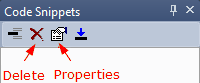 To delete a snippet, select the snippet you want to delete from the list and press Delete (X) button in the Code Snippets window.