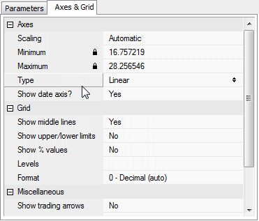 The Parameters window also allows you to control axes and grid appearance as well as some other per-chart settings. These controls are available in the second Axes & Grid tab as shown below:
