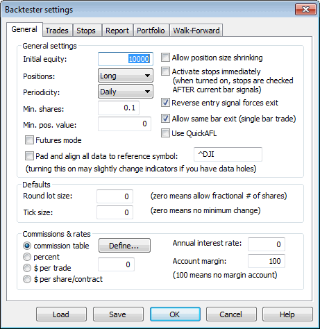 This setting defines the percentage margin requirement for the entire account. The default value of Account margin is 100. This means that you have to provide 100% funds to enter the trade, and this is how the backtester worked in previous versions. But now you can simulate a margin account. When you buy on margin you are simply borrowing money from your broker to buy stock. With current regulations you can put up 50% of the purchase price of the stock you wish to buy and borrow the other half from your broker. To simulate this just enter 50 in the Account margin field (see pic. 1) . If your initial equity is set to 10000 your buying power will then be 20000 and you will be able to enter bigger positions. Please note that this setting sets the margin for the entire account and it is NOT related to futures trading at all. In other words you can trade stocks on a margin account.
